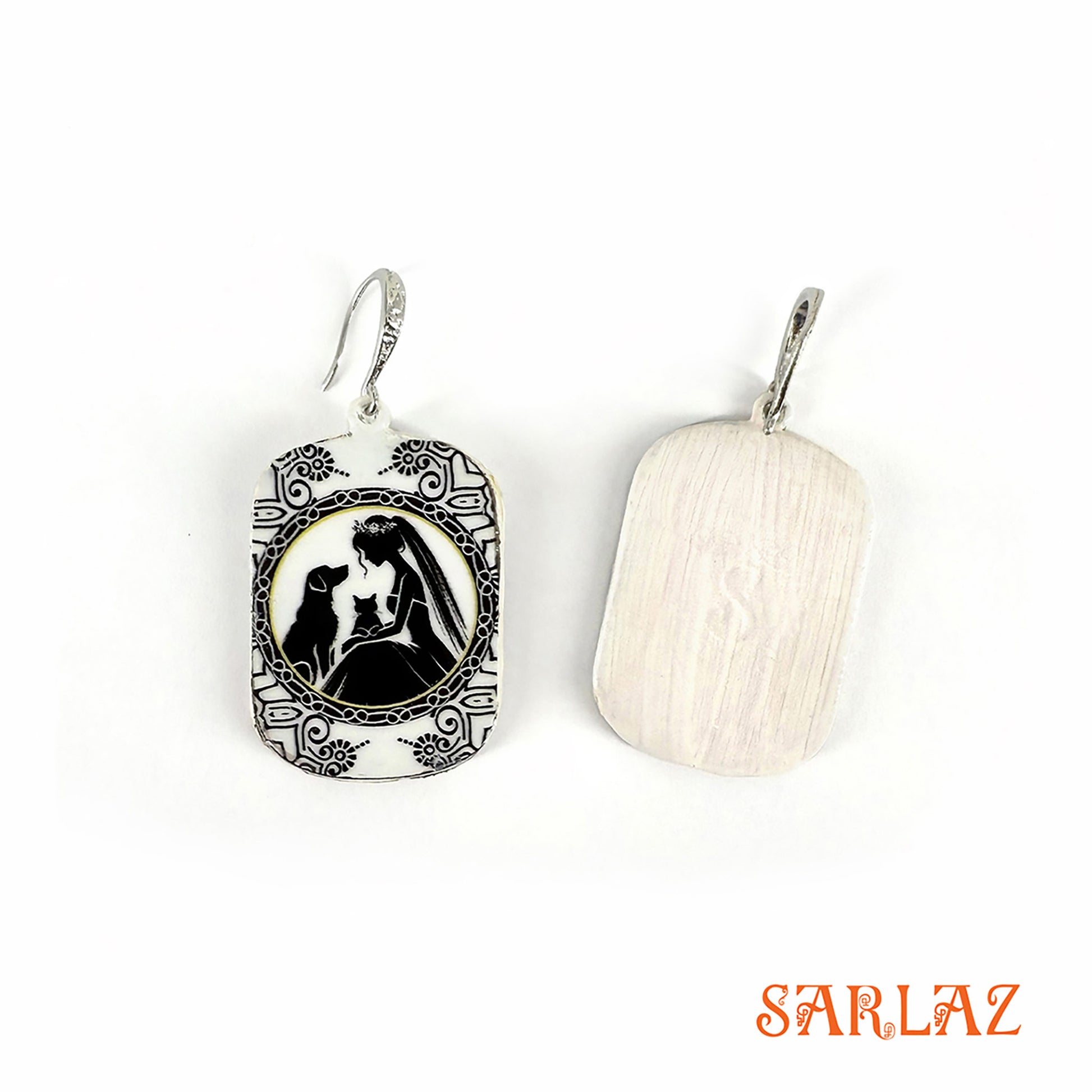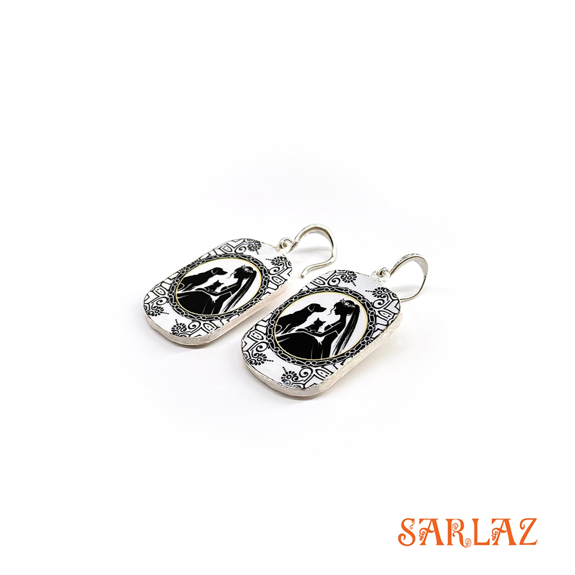 Rendered in striking black and white, this intimate moment sits within a rounded rectangle adorned with decorative scrollwork. The ornate frame transforms a tender scene into a wearable feeling.