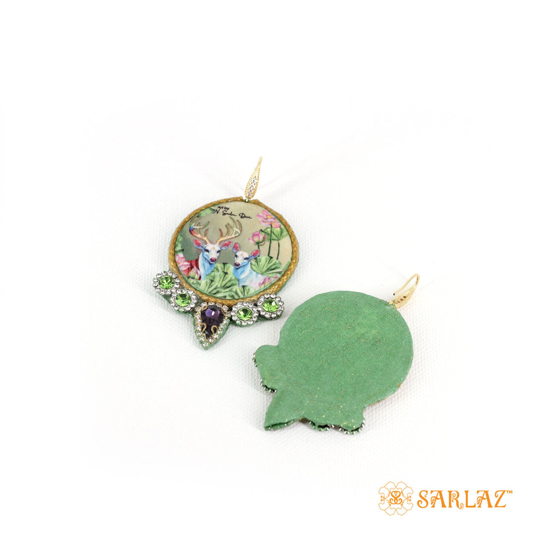 Crafted in a circle shape and adorned with montee stones, these earrings celebrate the majestic beauty of the deer. The artistry captures two deer, one adorned with a beautiful shawl, while the other stands gracefully alongside. Set against a serene spearmint green backdrop, these earrings radiate a sense of tranquillity and harmony.
