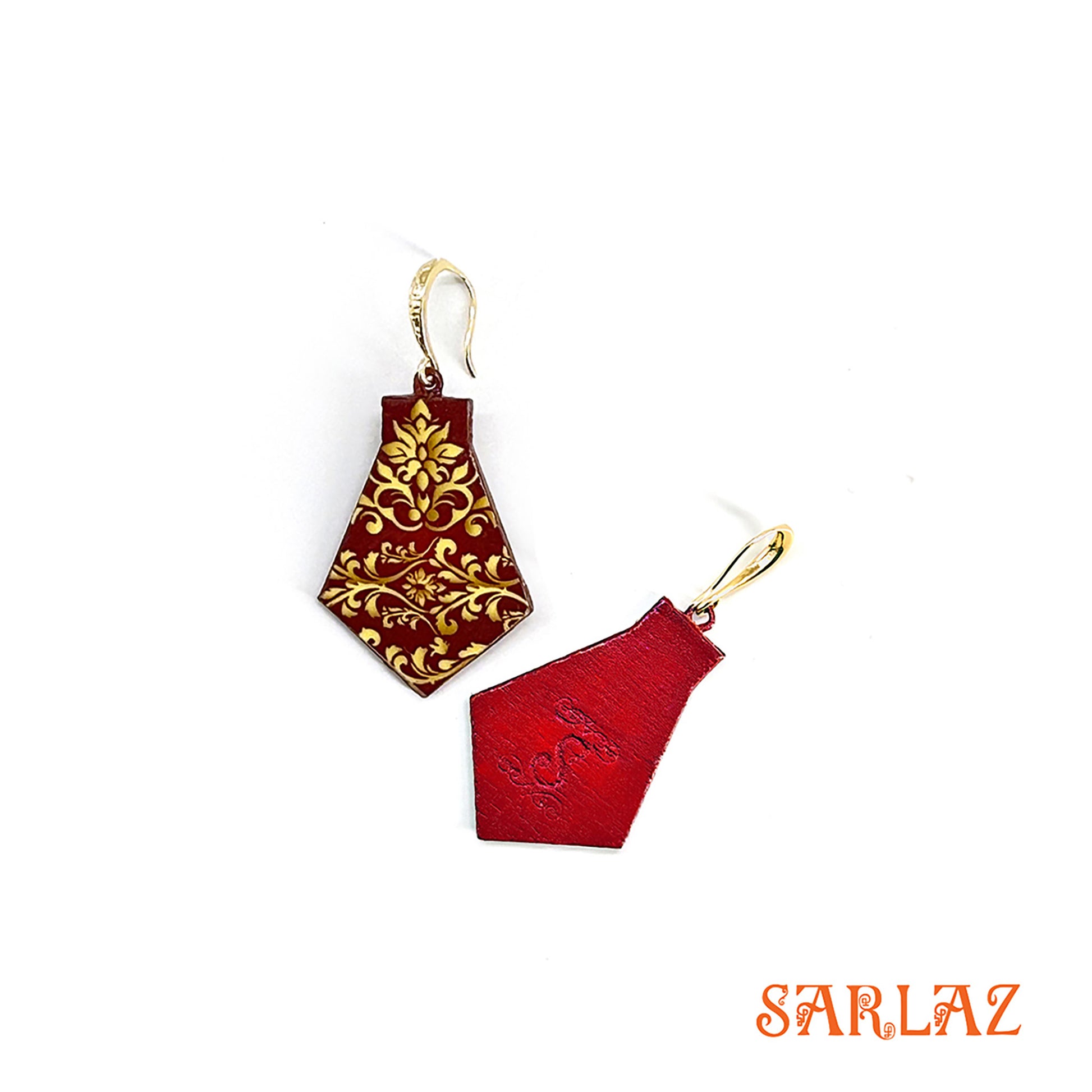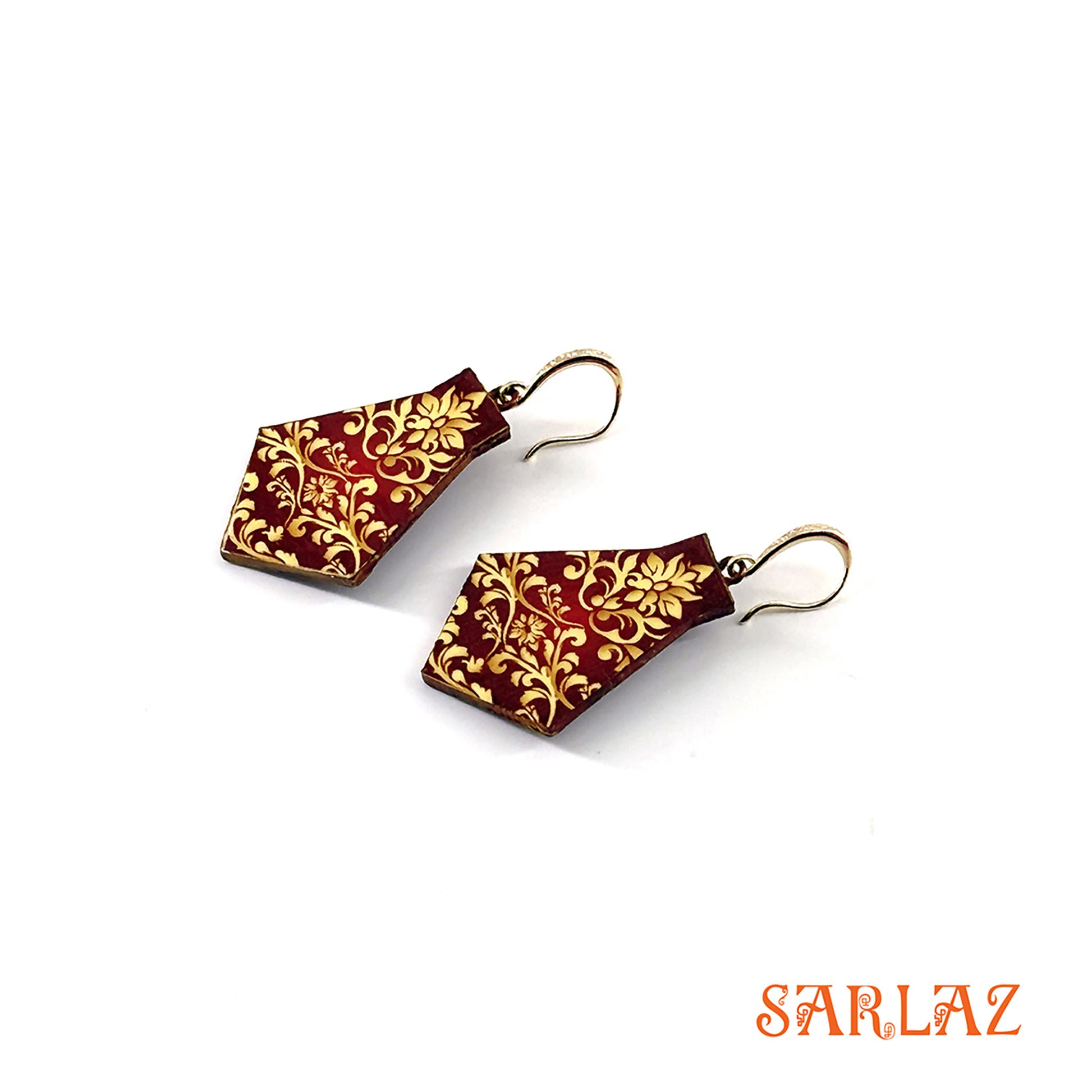 Golden vines curl across a rich maroon base in this trapezoid-shaped wooden earring. A design that balances ornate elegance with wearable simplicity.