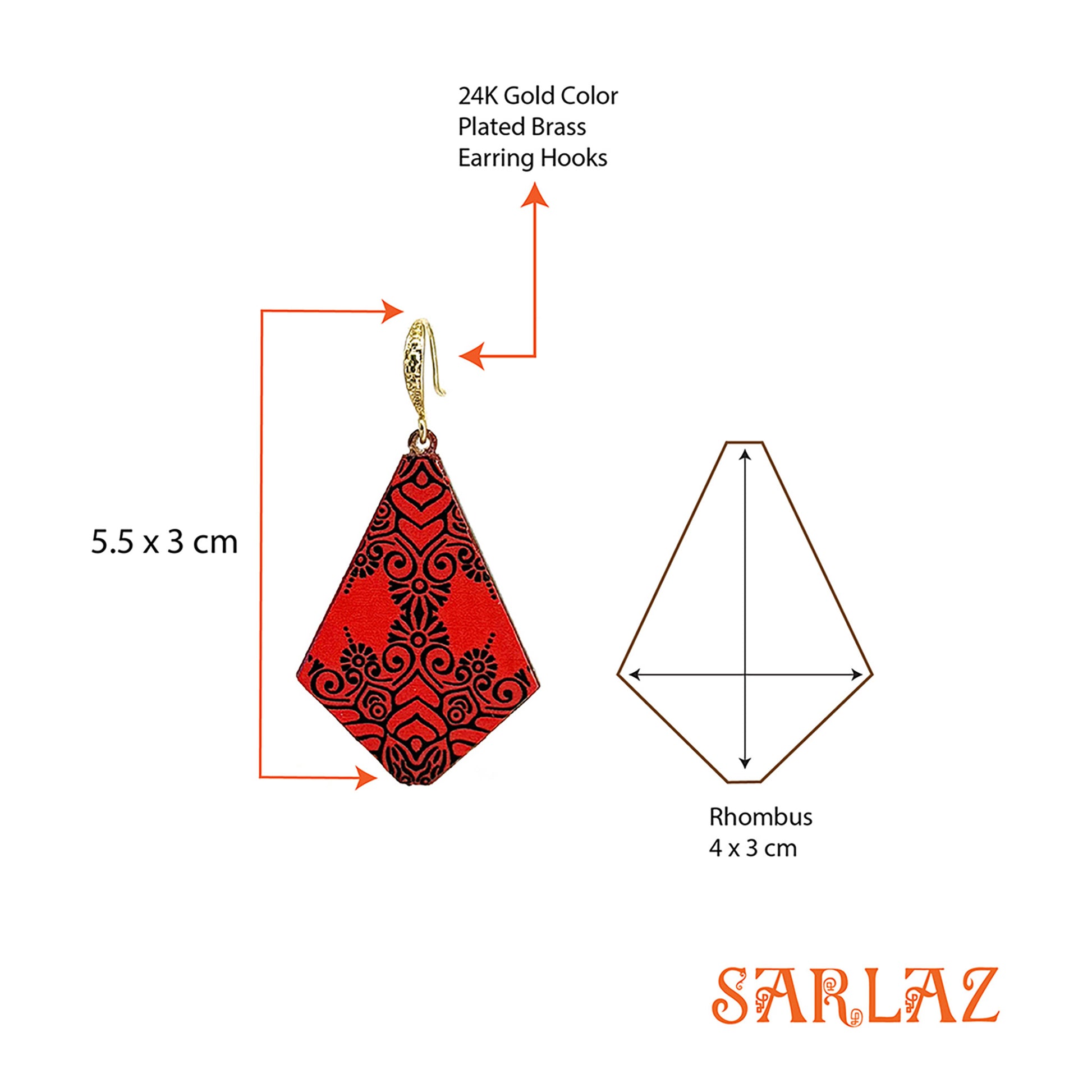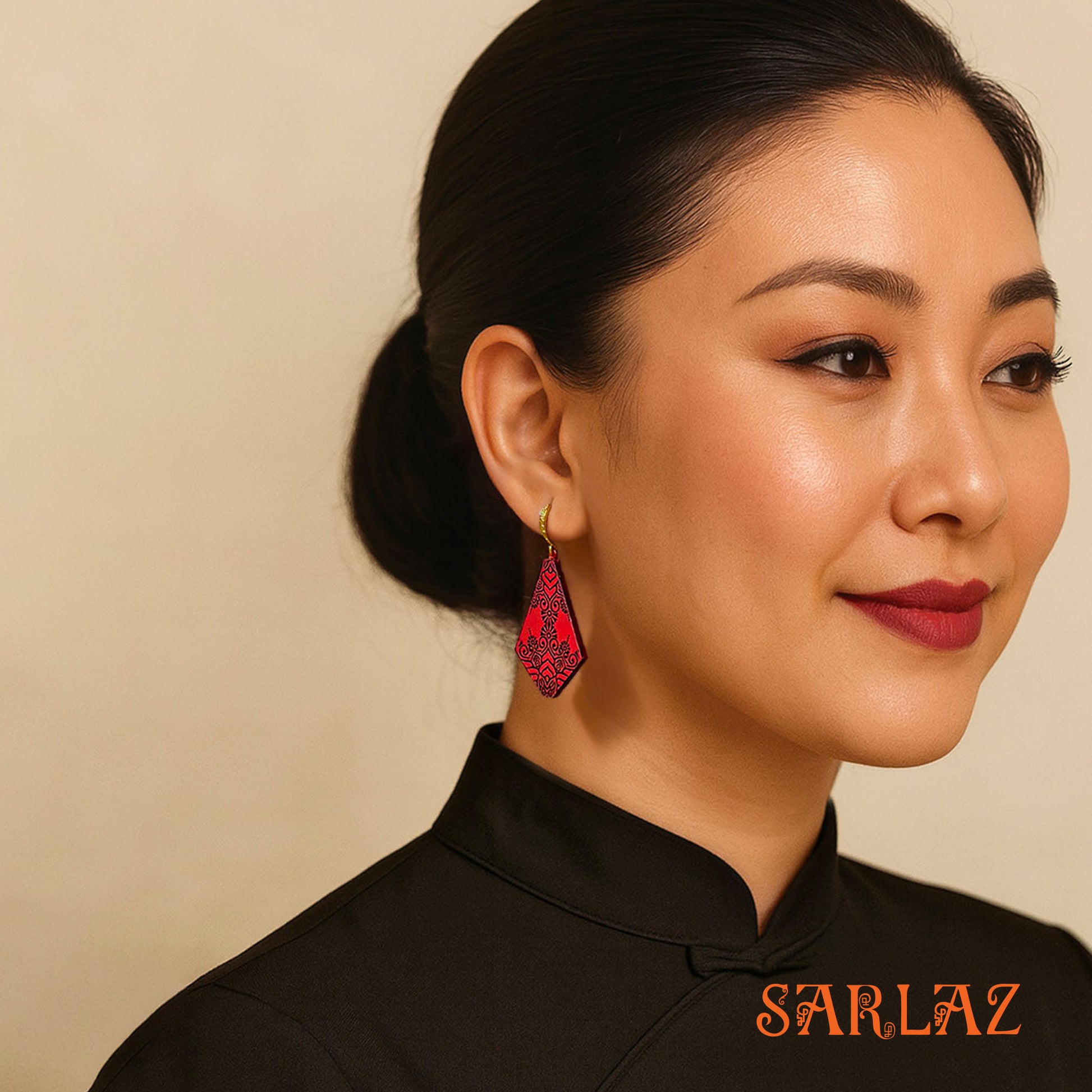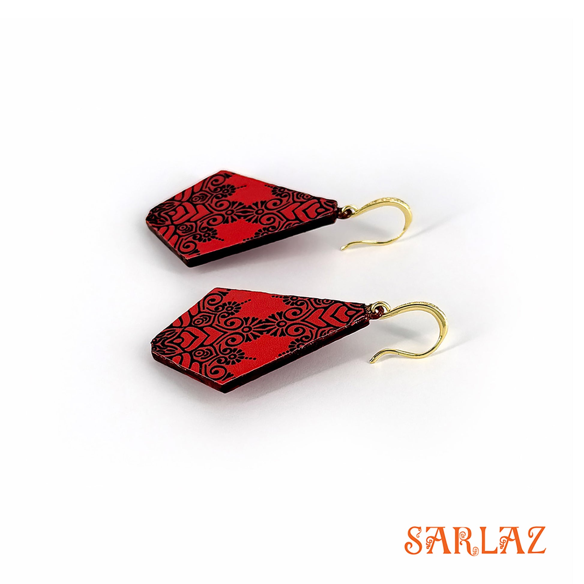 A flash of intense colour contained within a precise geometric form. The rhombus frame is a canvas for a vibrant scarlet, with an intricate black cipher that hints at hidden depths. The interplay of bold colour and detailed pattern creates a visual tension that is elegant.