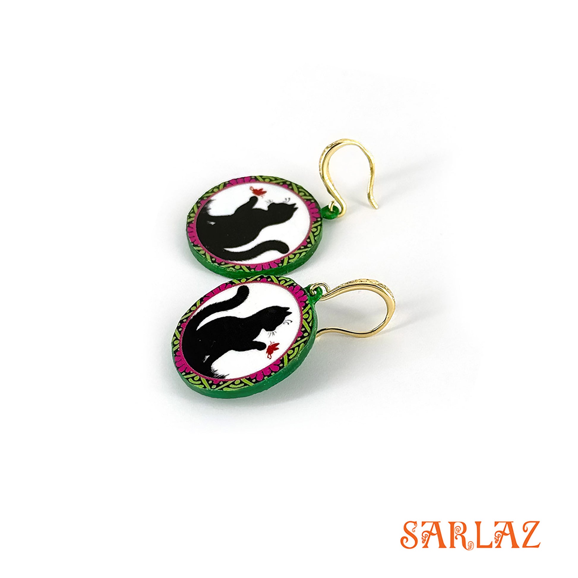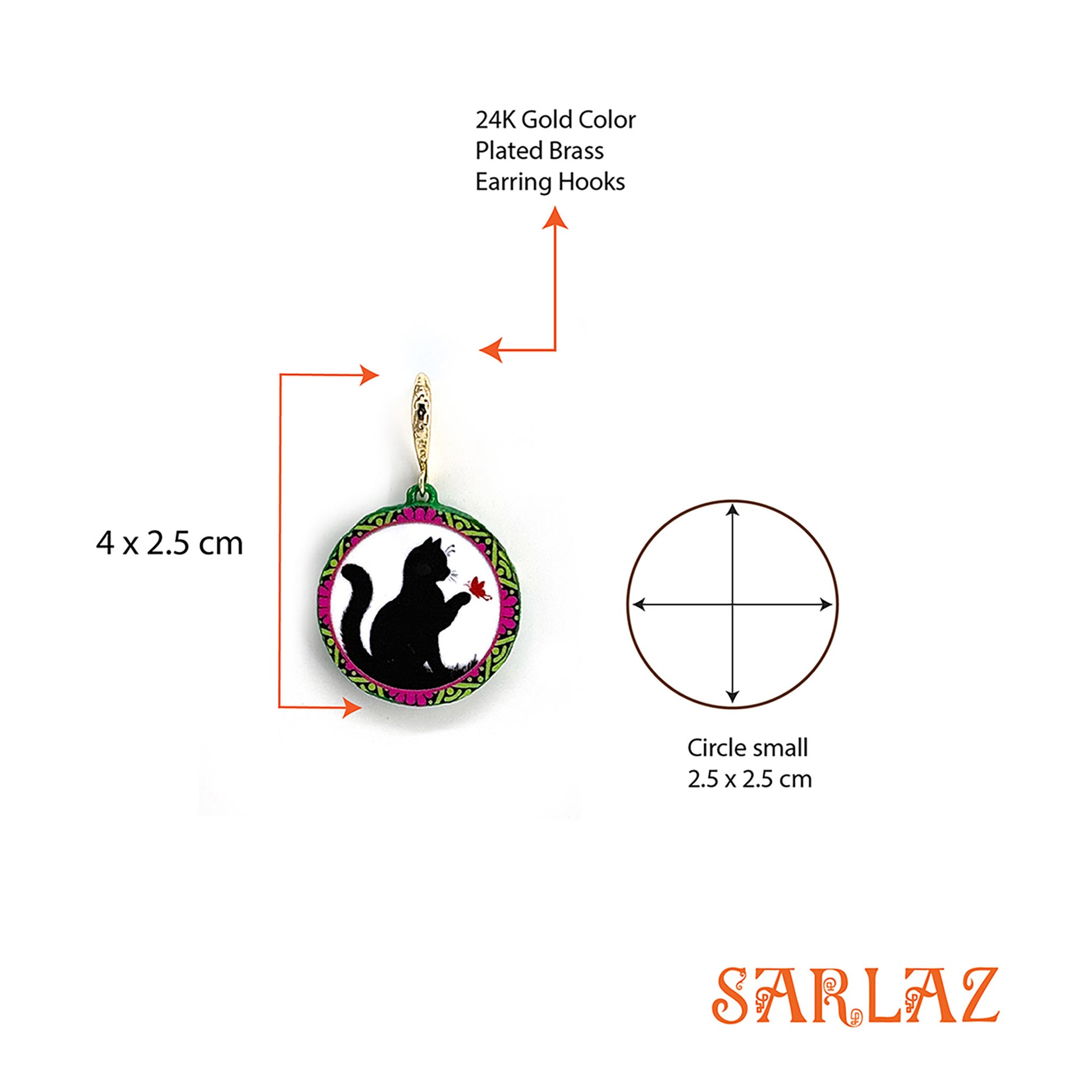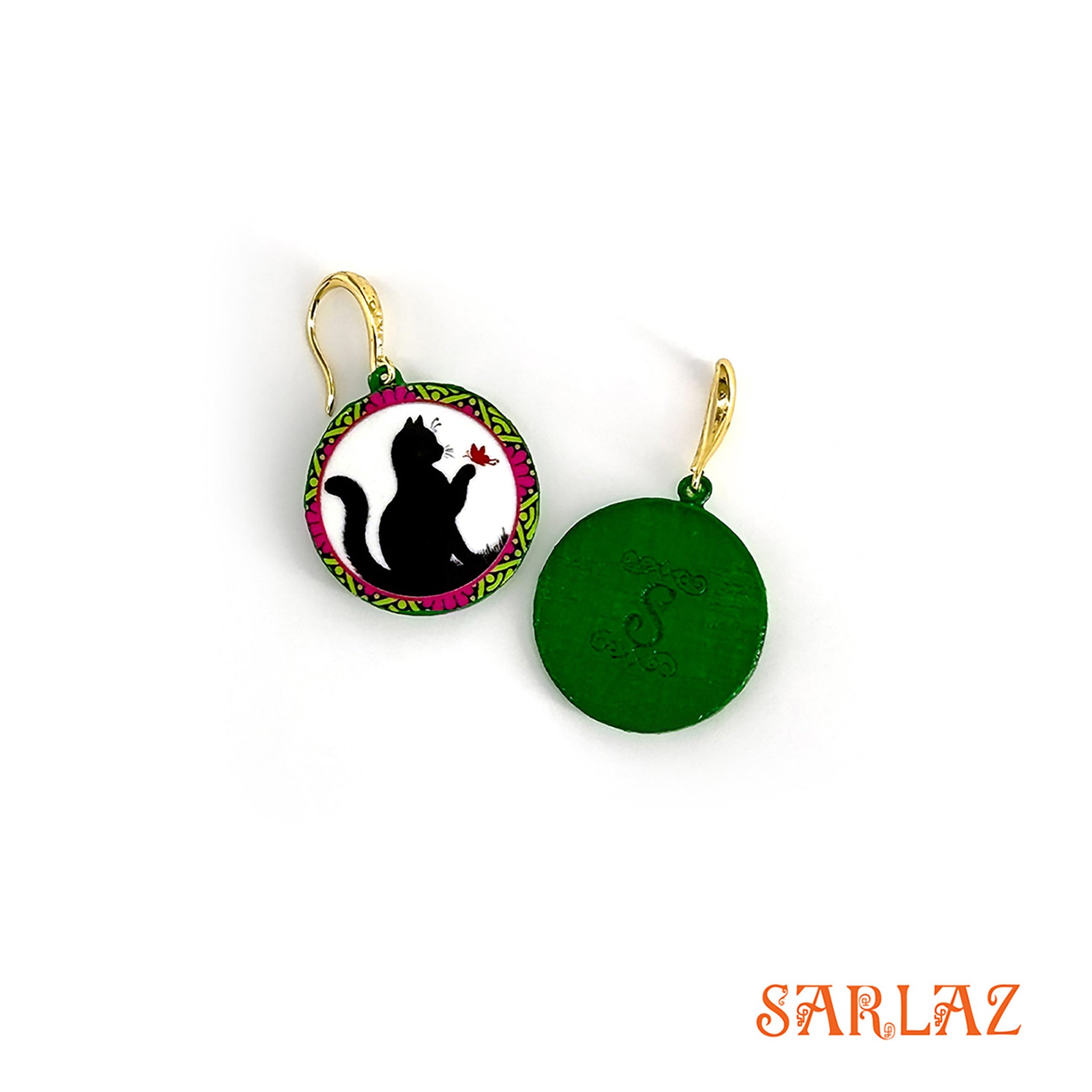 Set in a petite round frame, a silhouette of a cat gazes tenderly at a butterfly resting nearby. Hand-painted in warm hues with green and pink detailing, this design captures the quiet magic of curiosity meeting stillness.