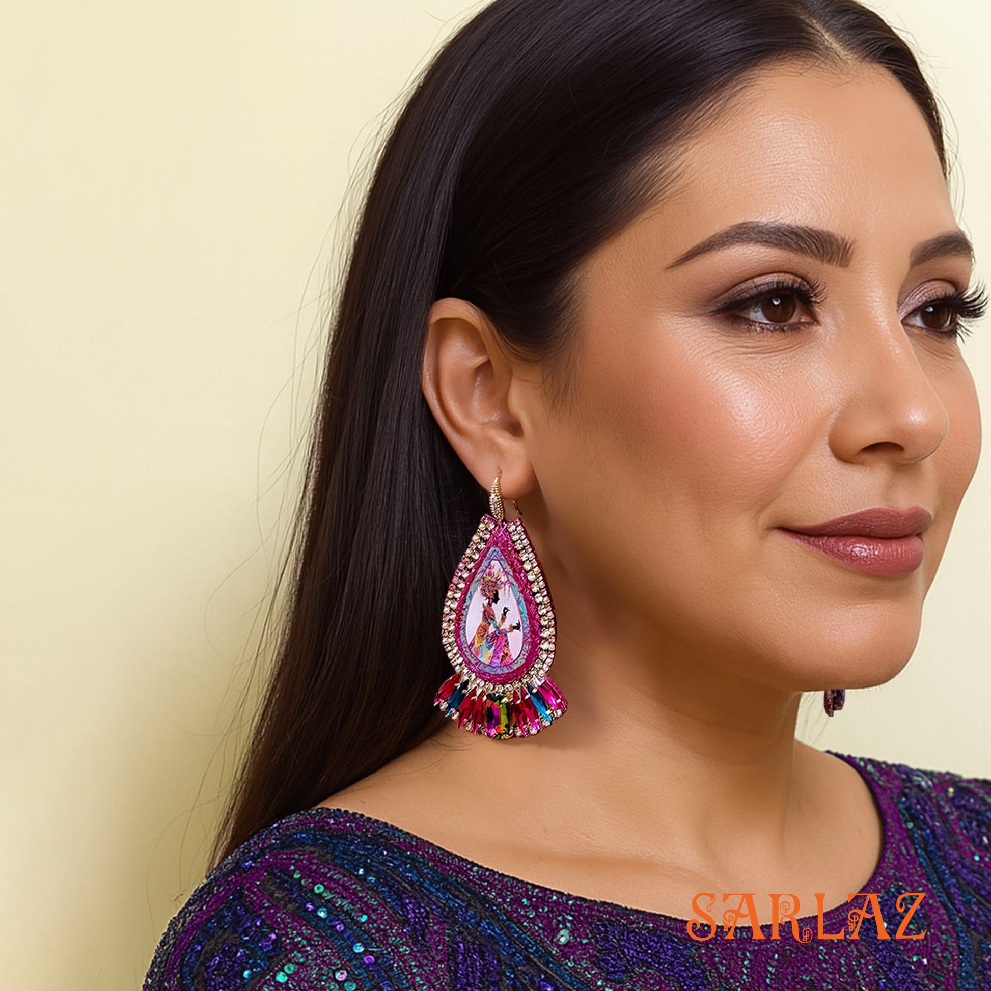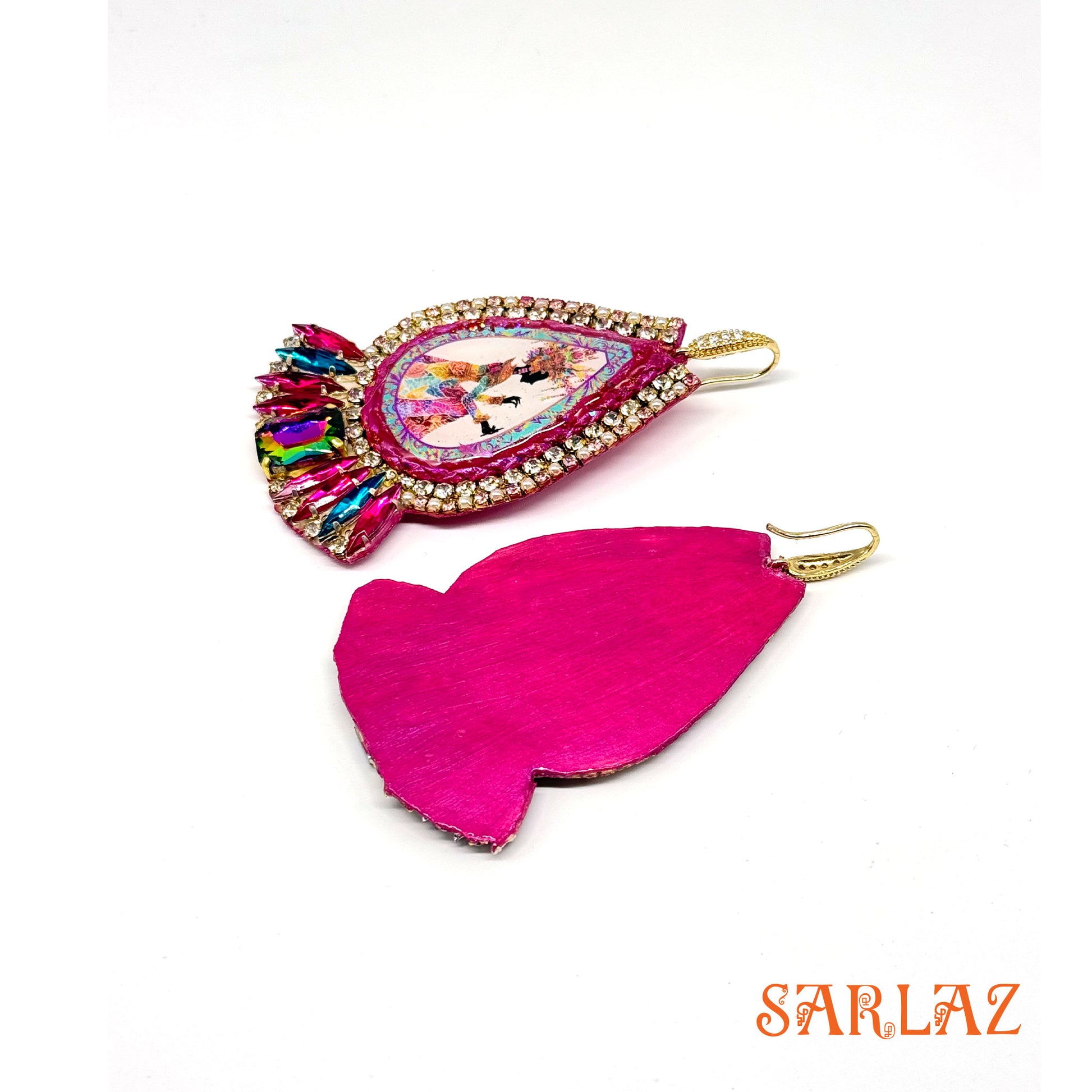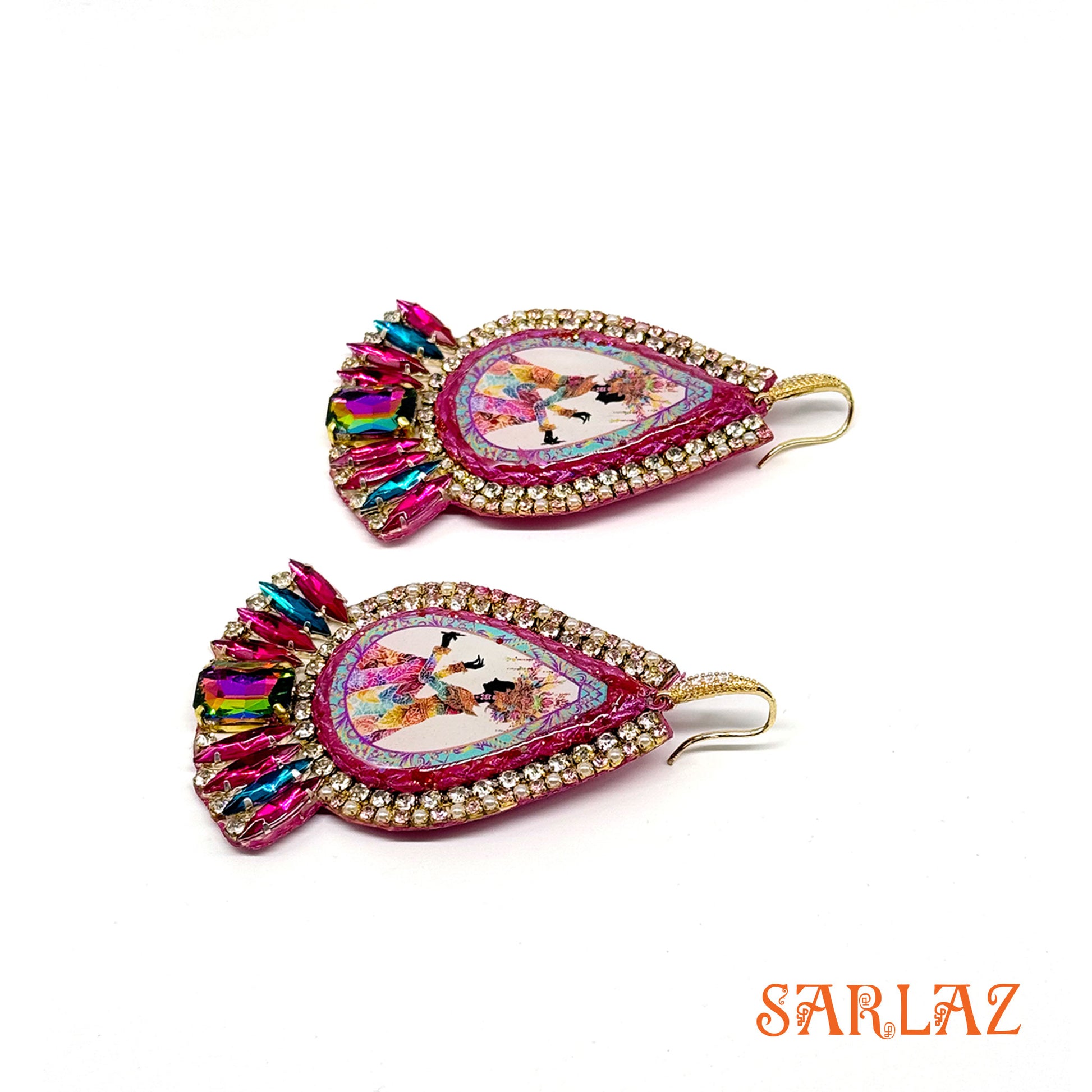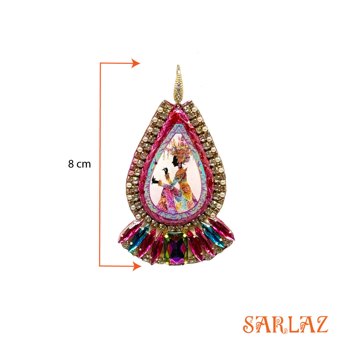 Set in a teardrop silhouette and finished with a rhinestone fan flourish — a burst of colour and light that carries the design with movement and grandeur.