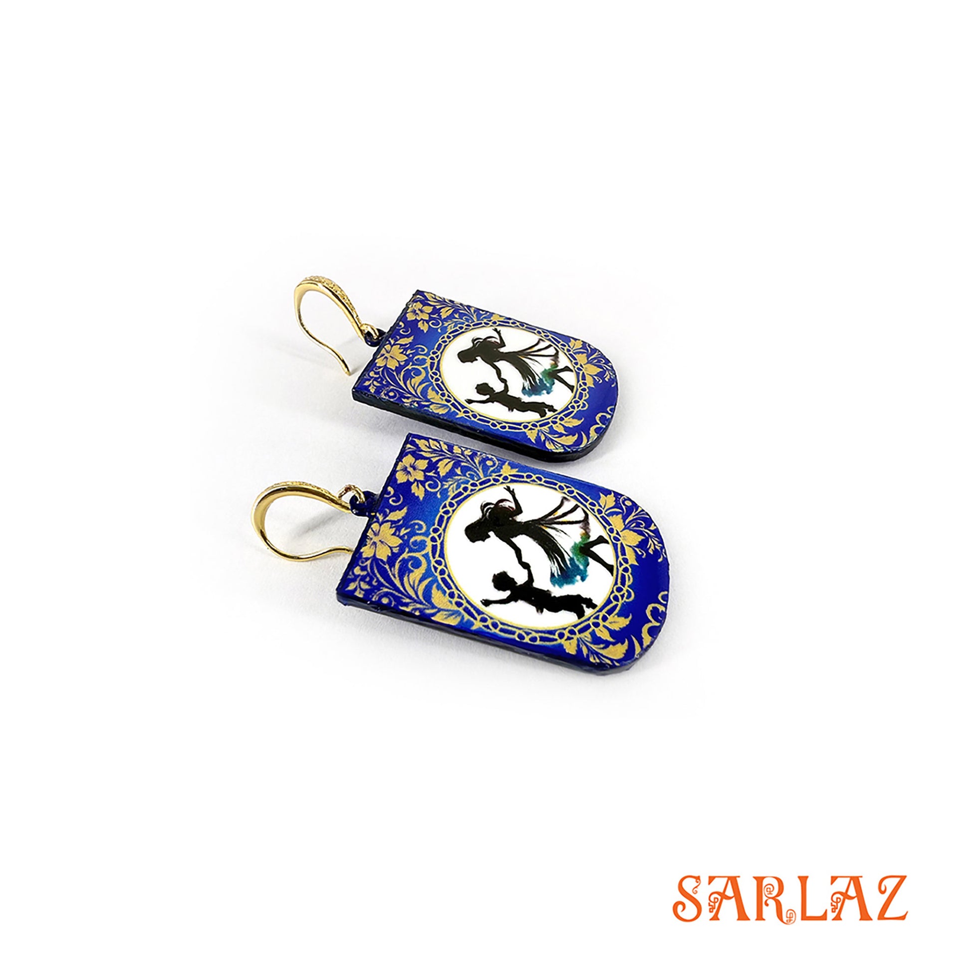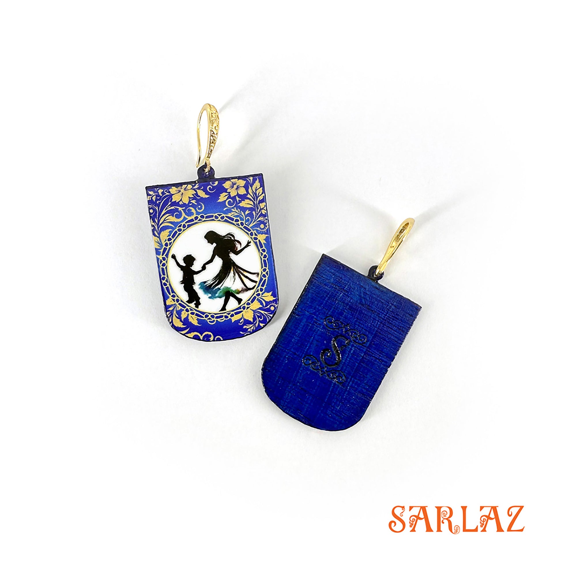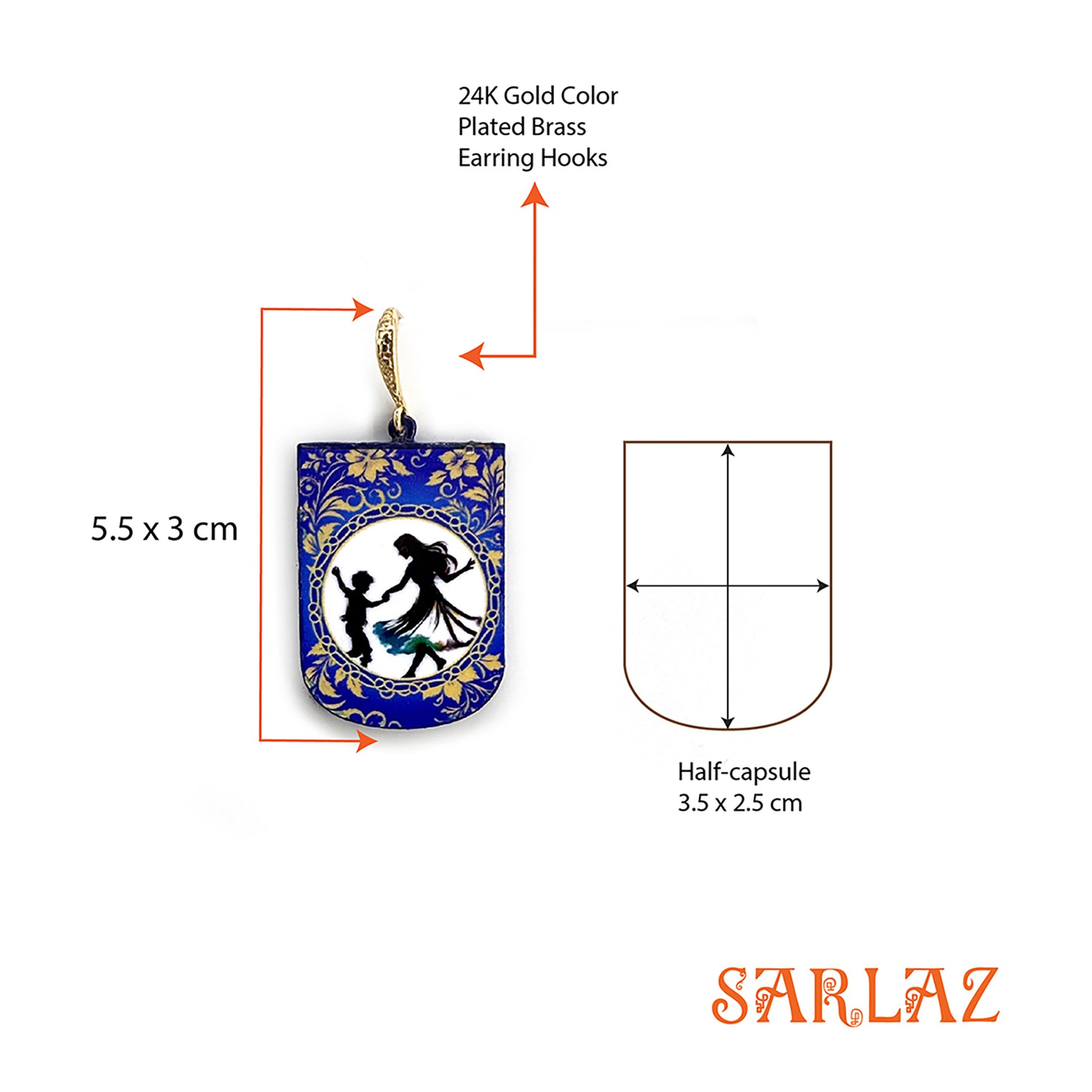 A joyful dance, full of happiness, captured in miniature. This piece is a testament to the closeness between a mother and her son—a bond that never fades. The black silhouette is a poignant visual story set against a rich blue background, framed by stylised golden details.