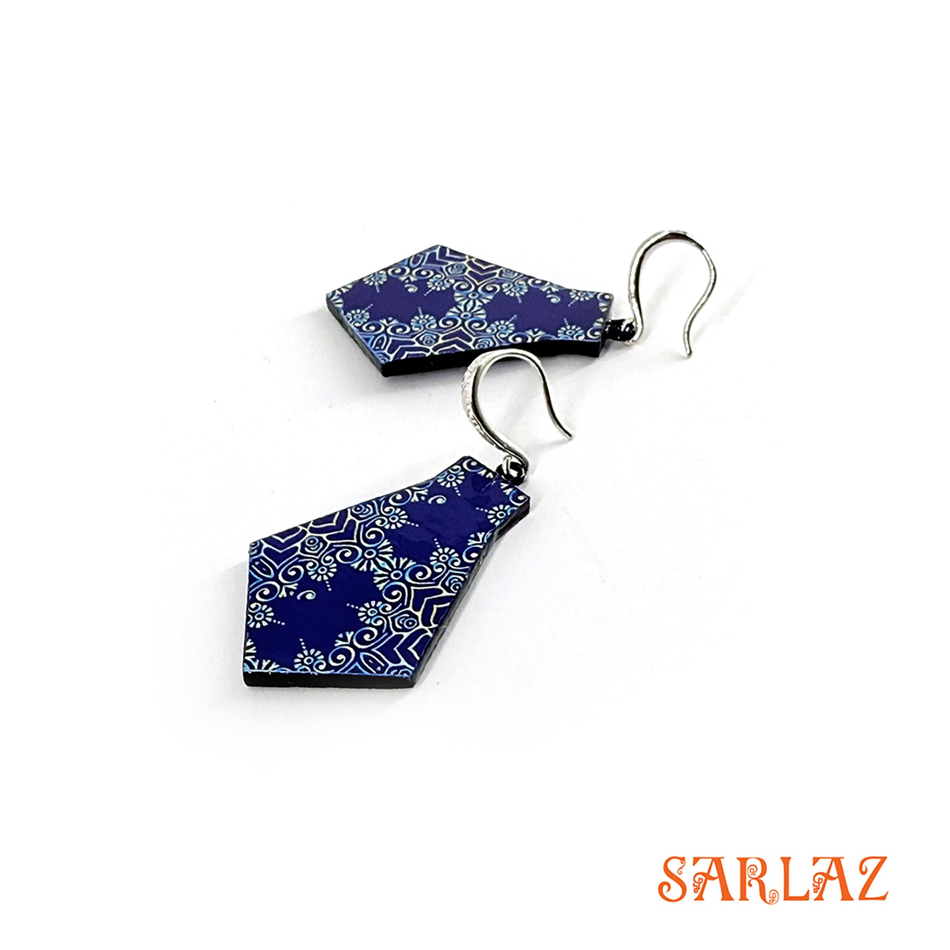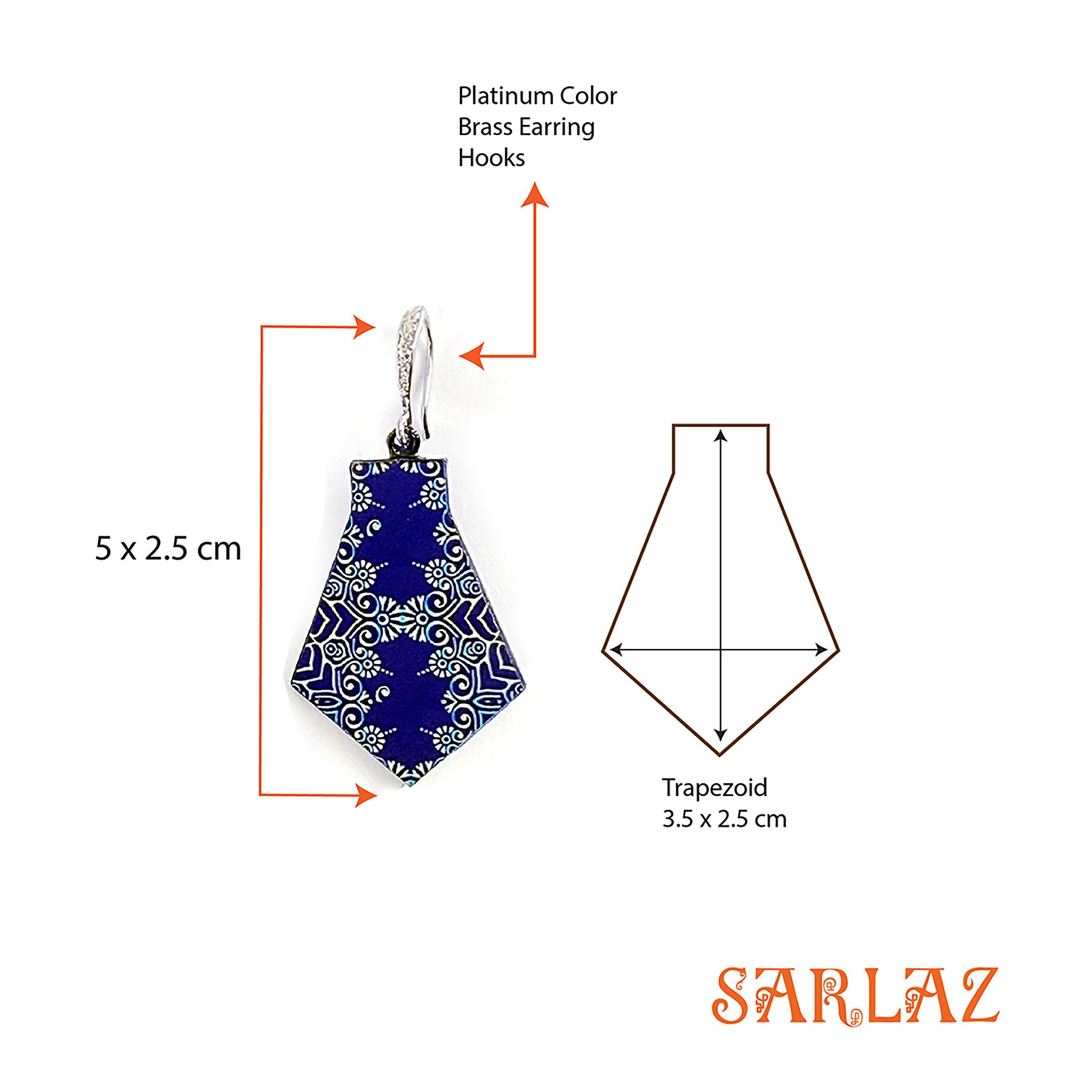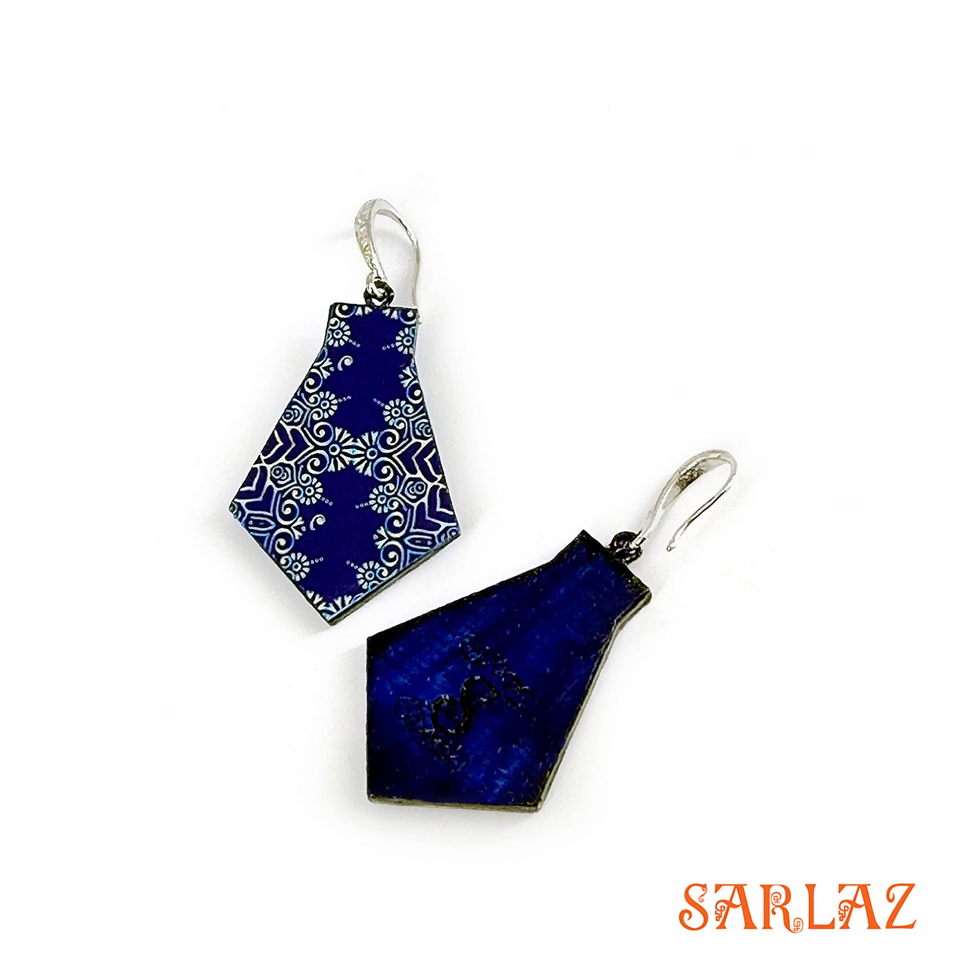 Hand-painted in deep navy on wood, this trapezoid-shaped design is adorned with delicate geometric florals in ivory white. It draws from the serenity of twilight—a piece that feels both intricate and still, like a hush in the dark.