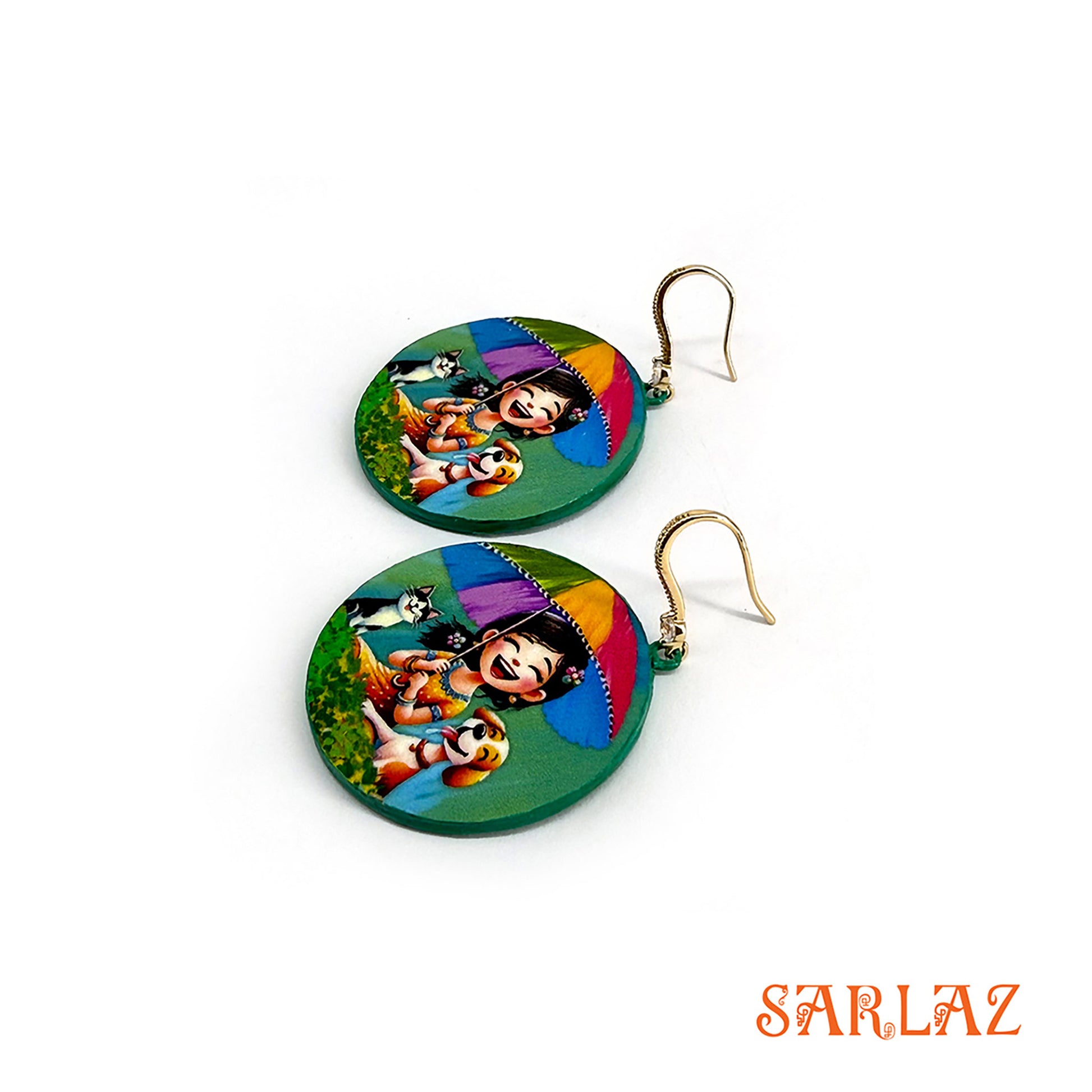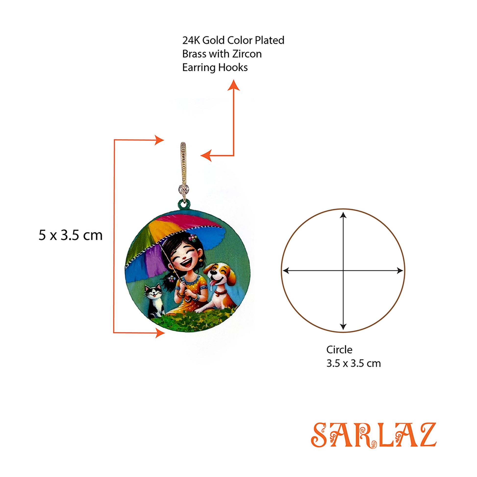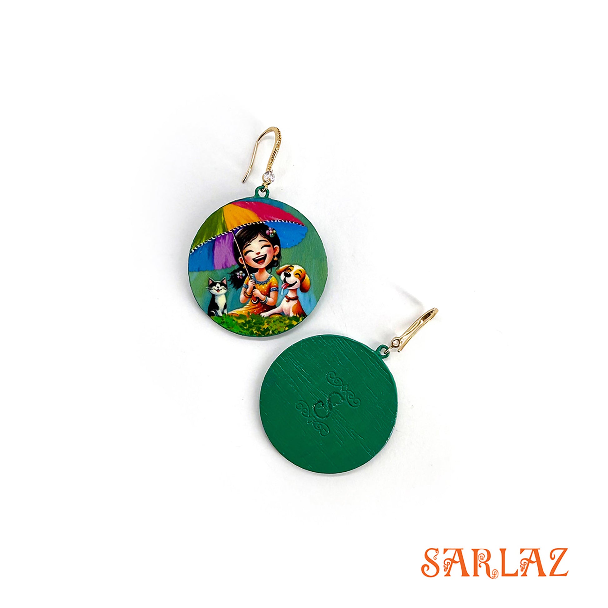 This round frame bursts with colour and joy. Beneath a rainbow-coloured umbrella, a small, perfect world unfolds — a girl sharing pure, carefree delight with her most cherished companions, her loyal dog and cat, co-conspirators in glee as rain turns into laughter.