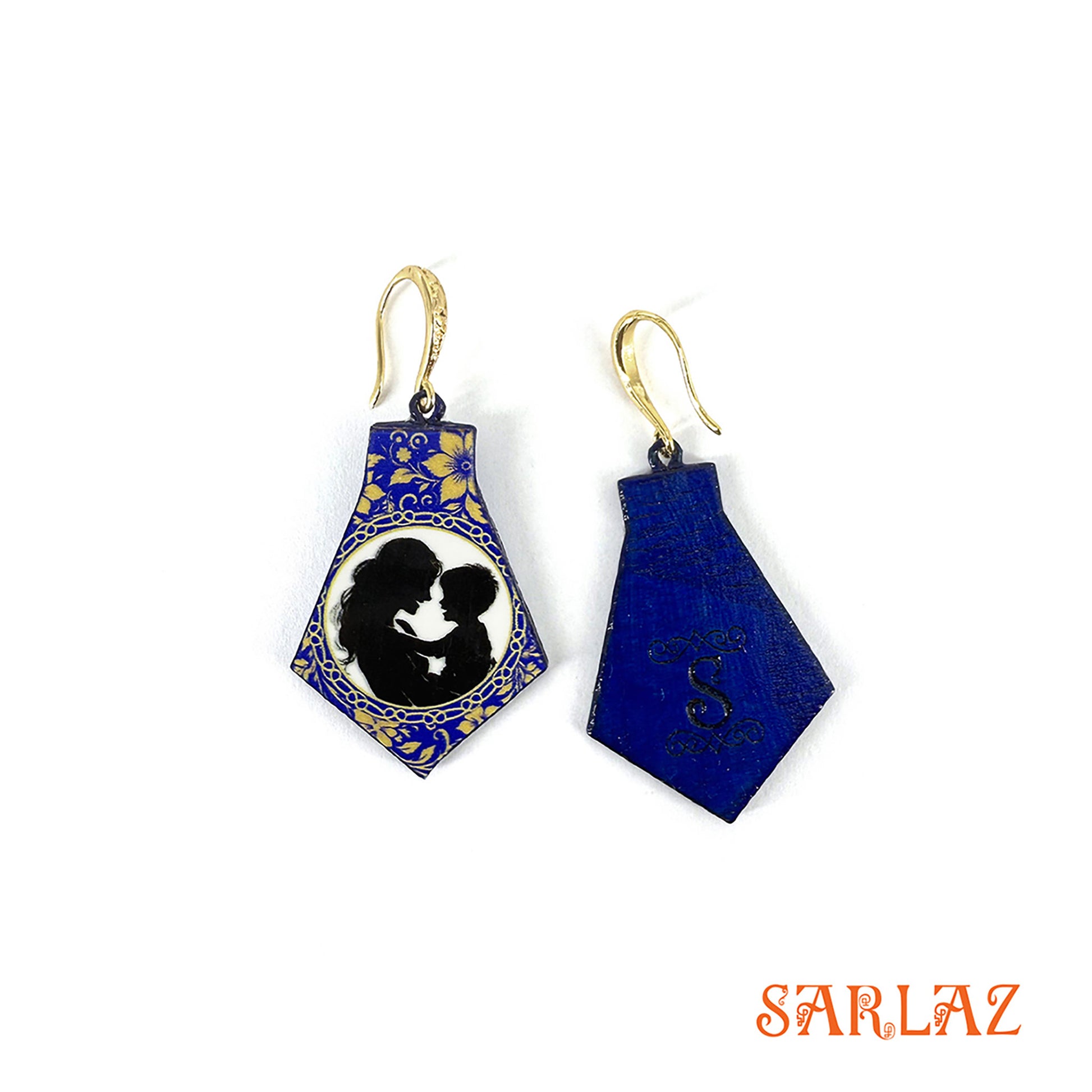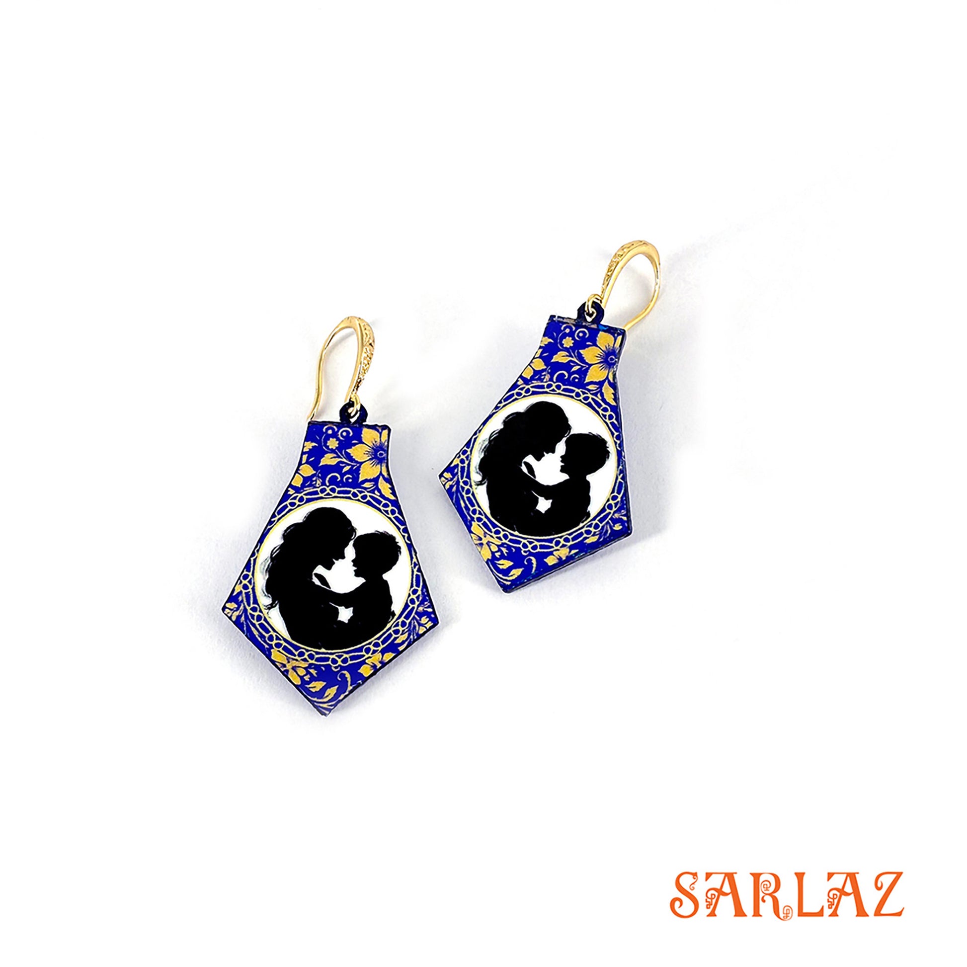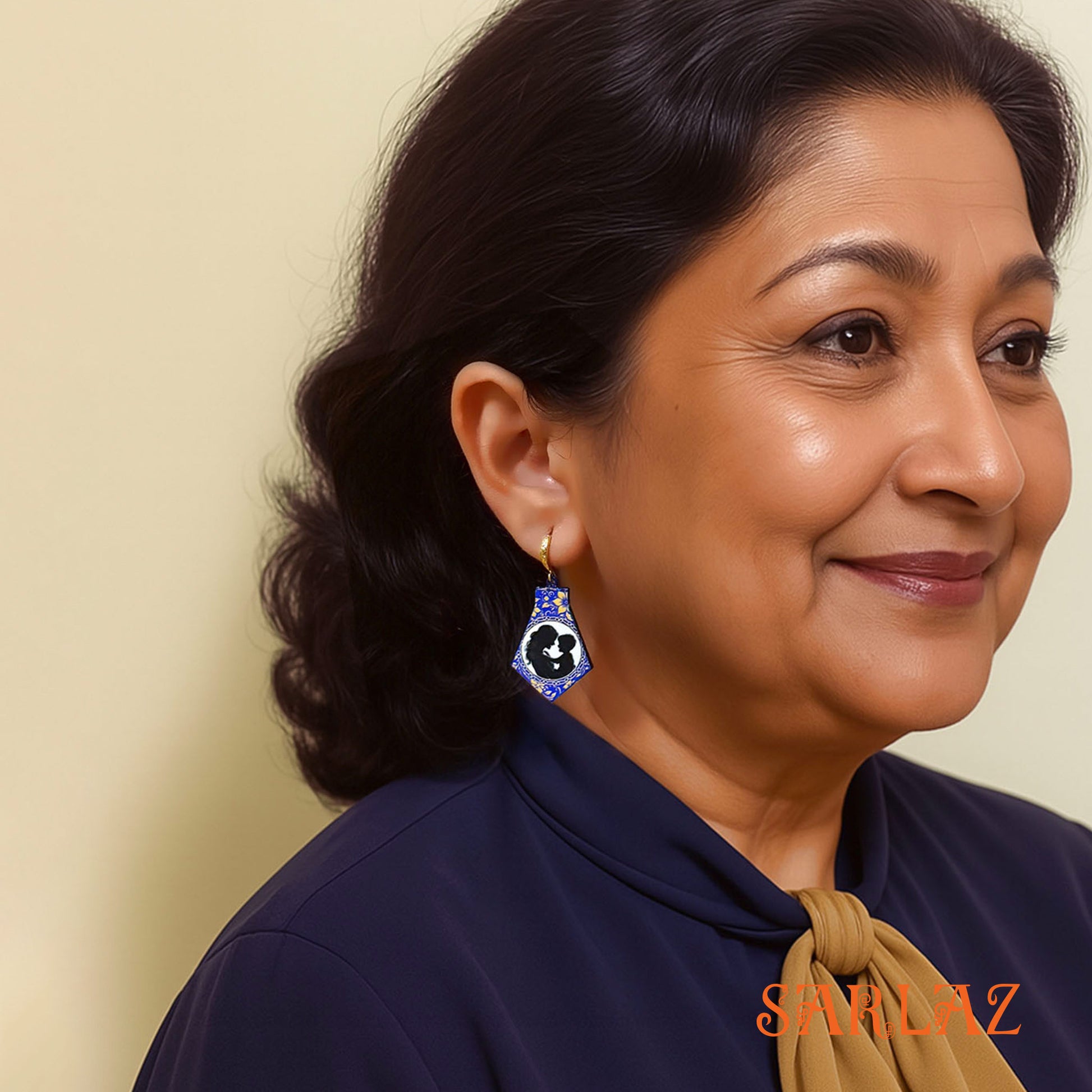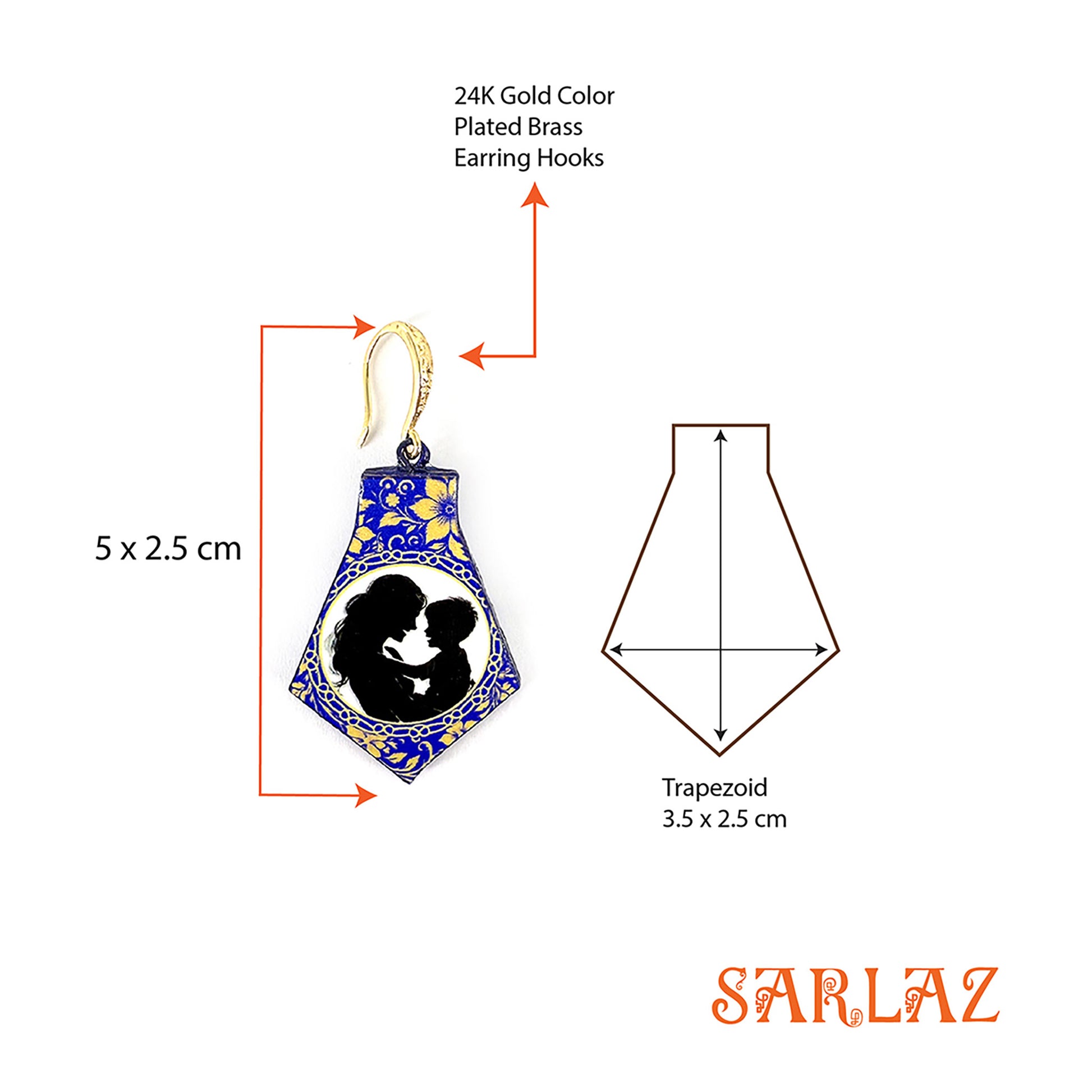 The Safe in Sight earrings become the emotional pivot. The artwork — a tender silhouette of a mother carrying her son — holds a nostalgic feel. Framed in a blue trapezoid with soft golden florals, it feels like a memory you carry, not just wear. A story, gently spoken. Always close. Always personal.