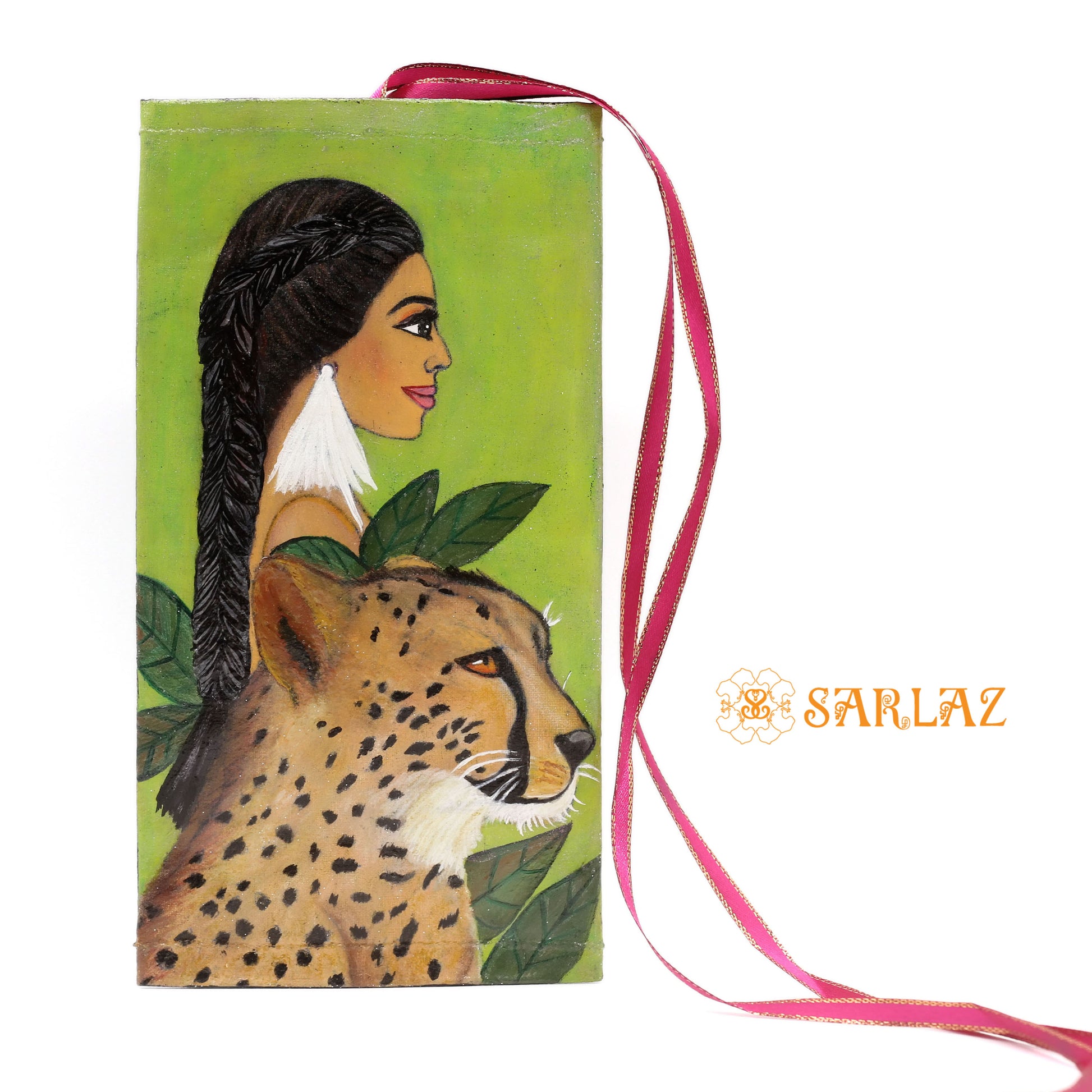 This phone pouch showcases a captivating scene: a woman with flowing braided hair gazes toward the horizon, sharing an extraordinary moment with a majestic cheetah. The artwork captures the woman's serene smile and the cheetah's calm demeanour, evoking a powerful sense of connection and untamed spirit.