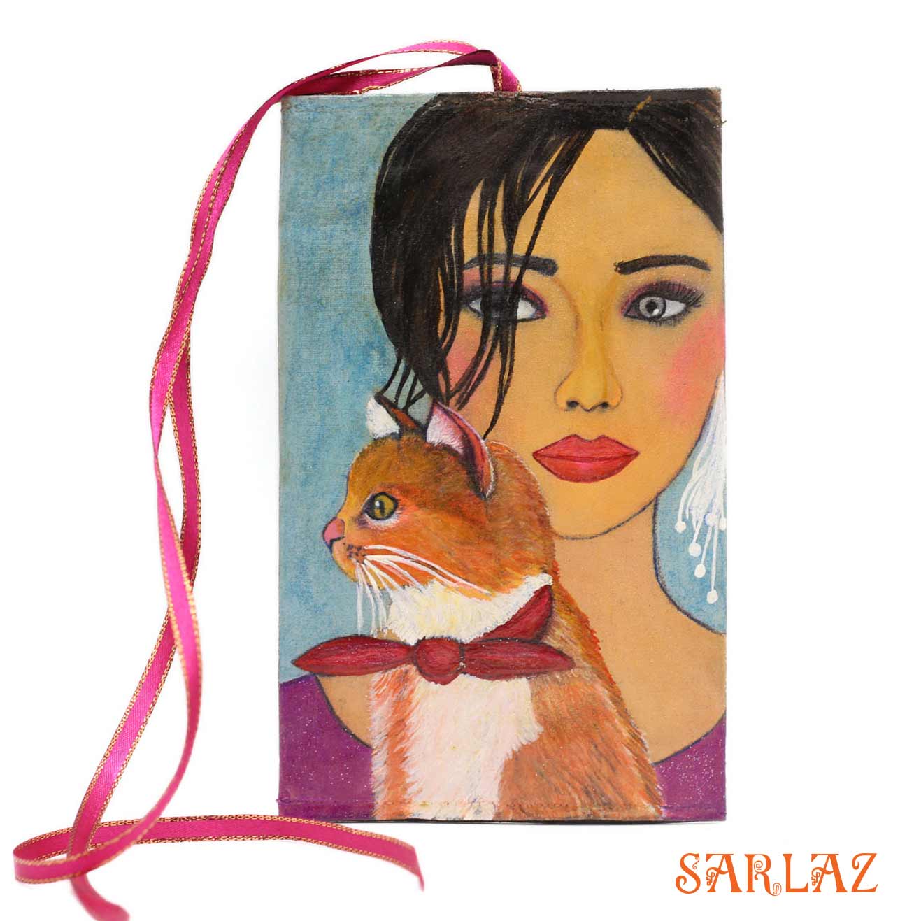 Discover the essence of companionship and inspiration with the Gocool phone pouch. This striking piece beautifully illustrates the special bond between a woman with her cat, Gocool, who is adorned with a stylish red scarf. The cat's playful gaze and spirited personality contrast with the woman's serene demeanour, reflecting their deep mutual understanding and affection.