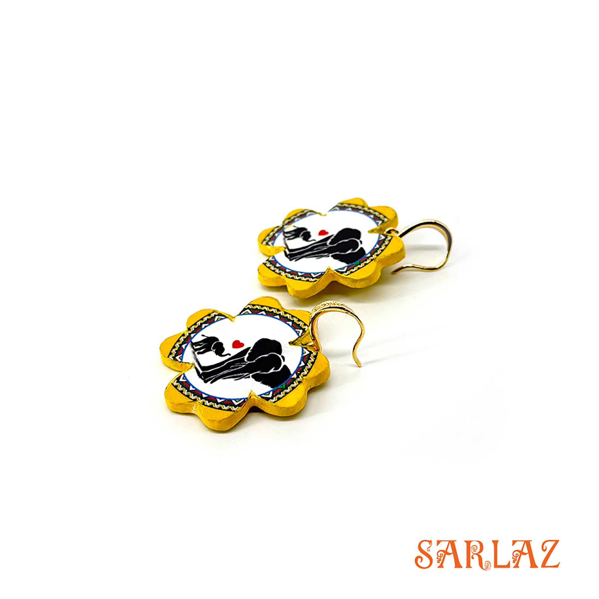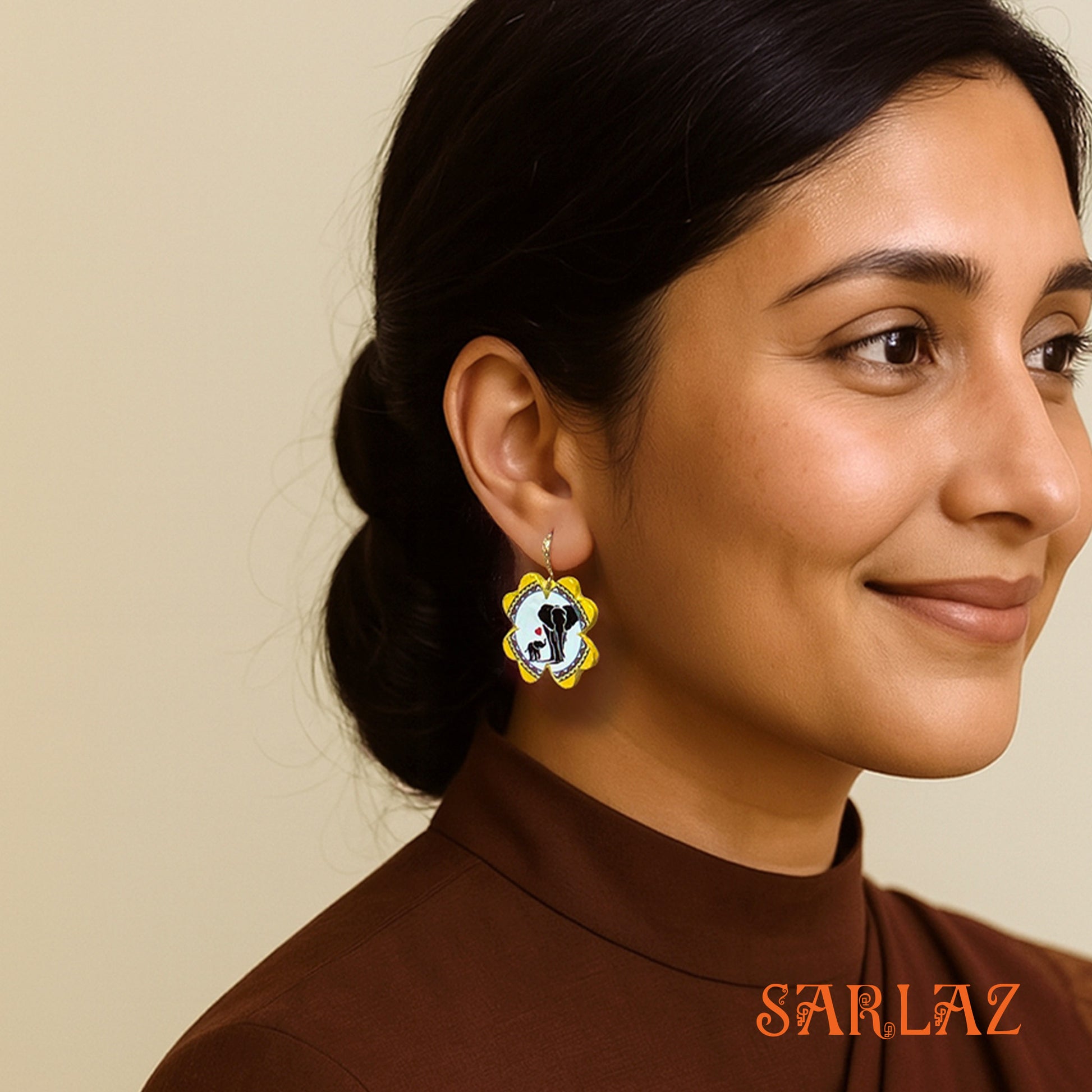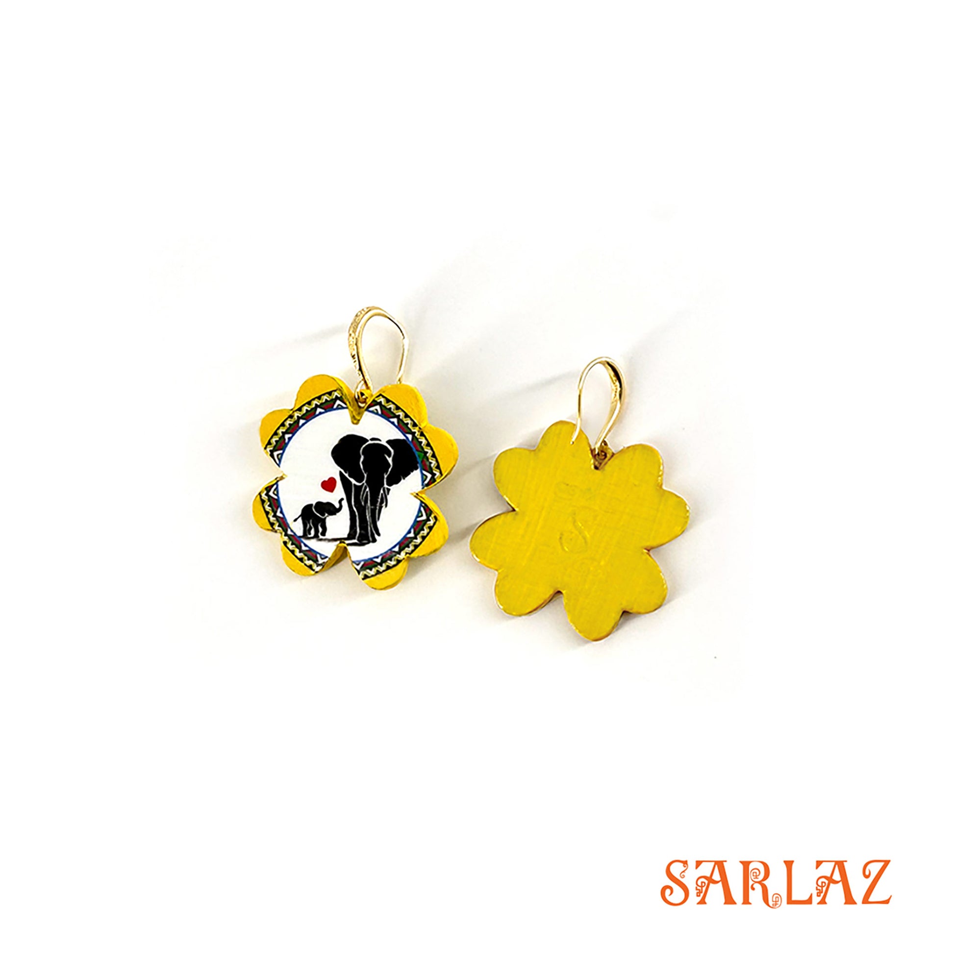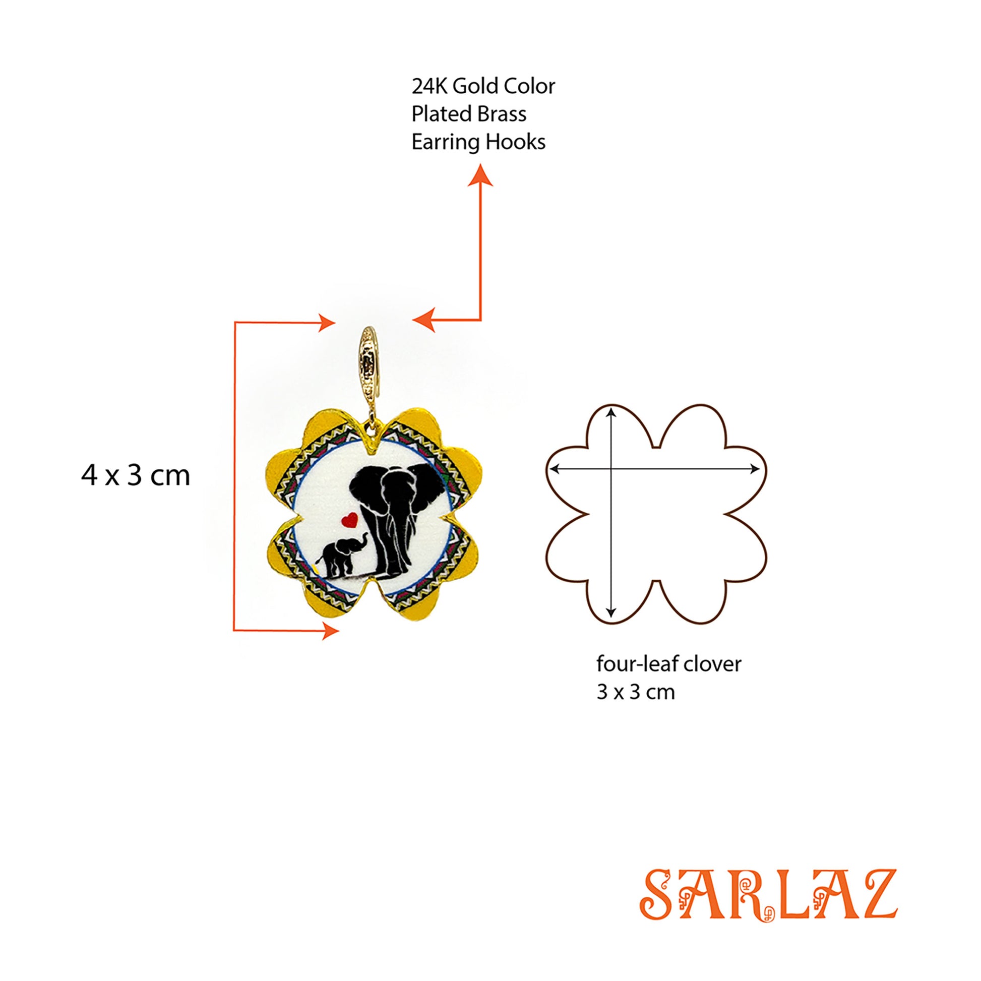 A mother elephant and her calf touch trunks beneath a tiny red heart, captured in a cheerful yellow-and-black floral setting. Hand-painted on wood in a four-leaf clover shape, this design honours the simplest forms of love—the kind felt without saying a word.