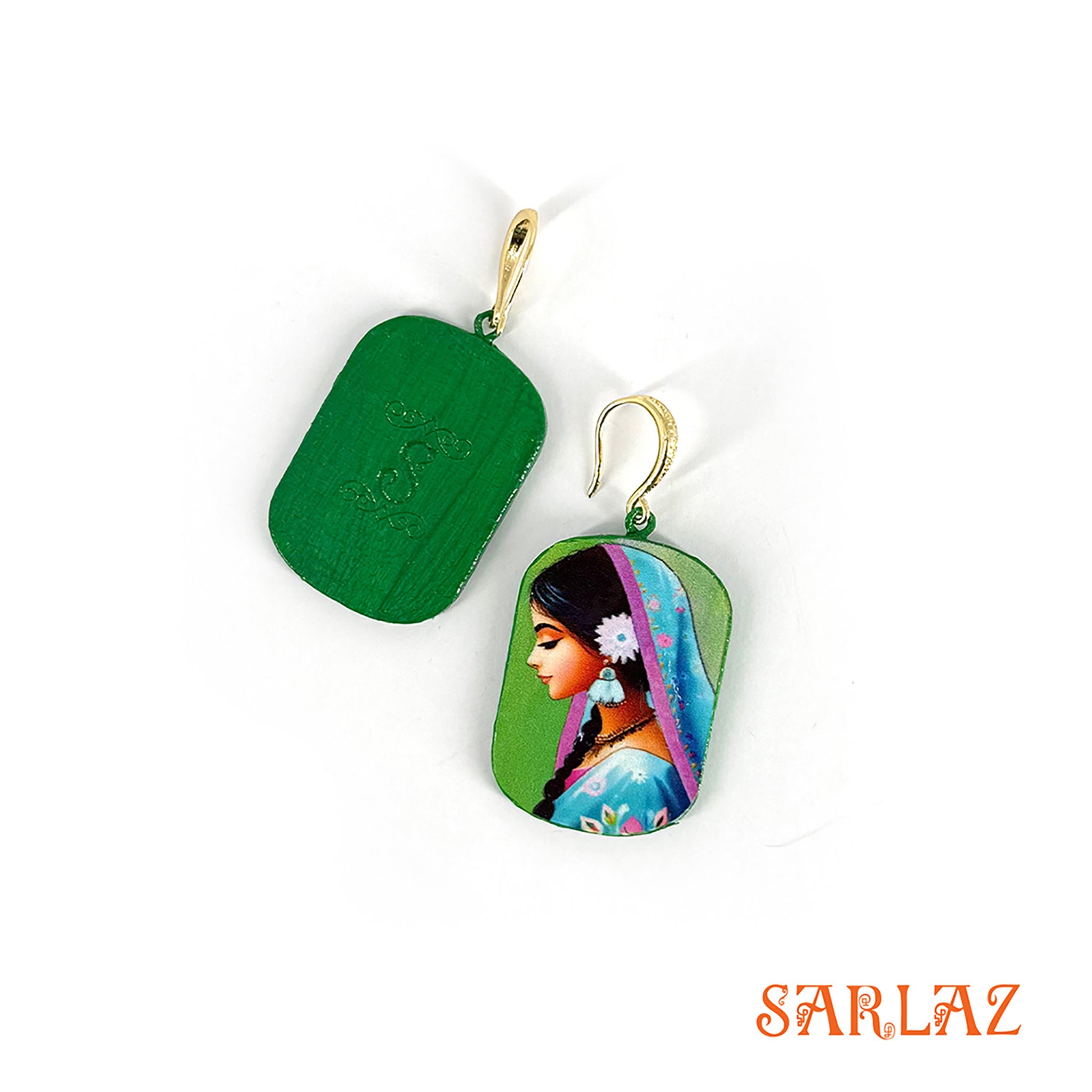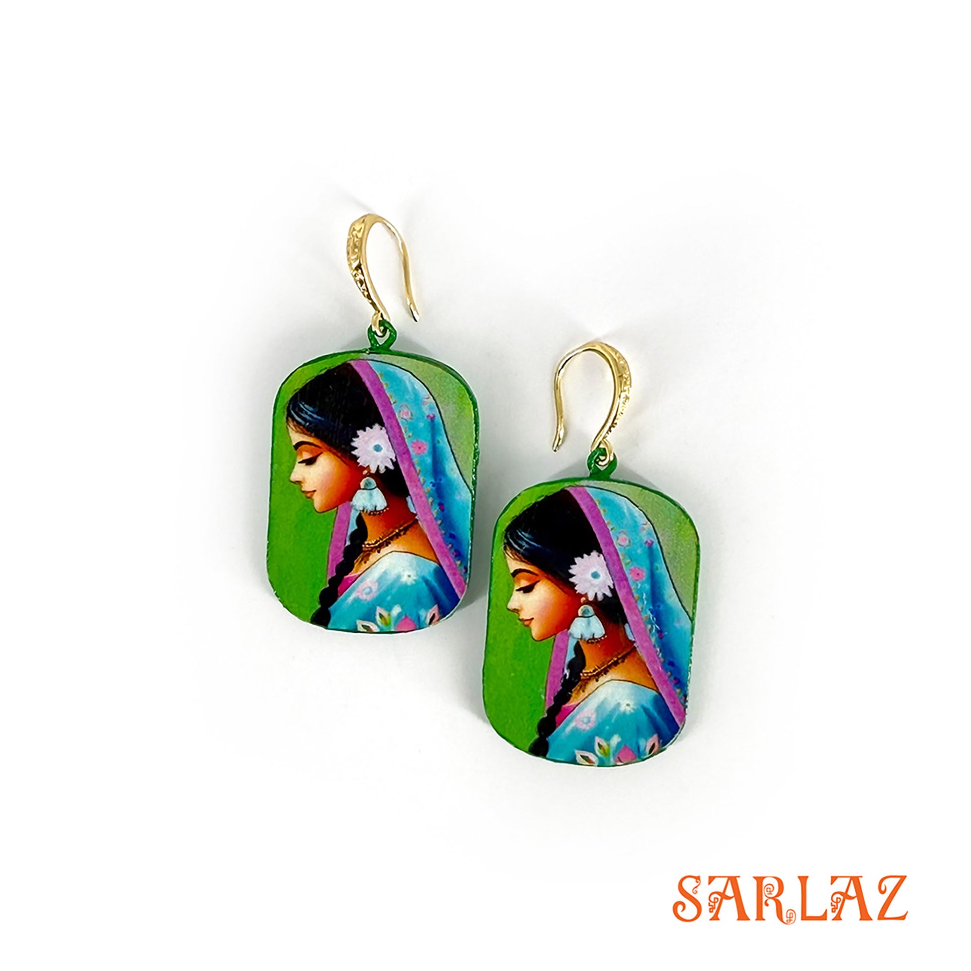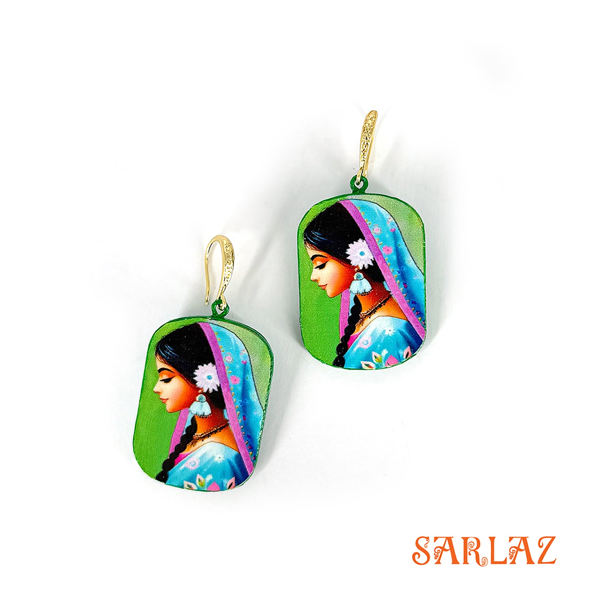 This design carries a rare calm in this portrait—the kind that doesn’t ask to be noticed, yet is so compelling it makes you intrigued. A woman draped in her shawl, her tassel earrings bold, her gaze lowered—it feels less like portraiture and more like a state of being. There’s composure here, but also a quiet spark that makes the stillness radiant.