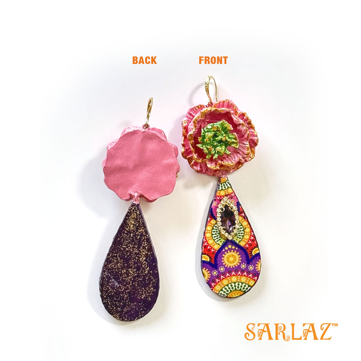 The Whimsical Bloom Earrings celebrate artistic craftsmanship with a vibrant blend of playful patterns and elegant design. Sculpted freehand from air-dry clay and finished with a high premium gloss, these earrings are shaped into bold and unique flowers in whimsical pink and green hues. Each flower is paired with a vibrant teardrop shape, intricately patterned and adorned with a sparkling Montee stone at its centre. The result is a striking statement piece that is unique and truly one of a kind.