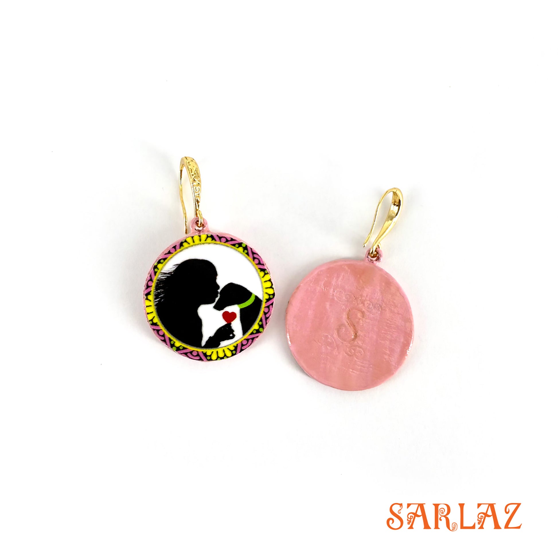 A kiss for the one who never left her side. Set within a vibrant pattern of yellows and pinks, this moment of pure affection needs no translation. A woman and her dog, a kiss, a red heart marking the spot where love lives.